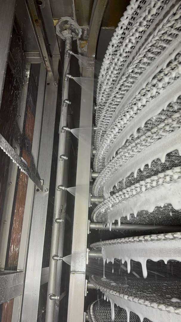 「CIP洗浄」の核となる部分です。「スパイラルフリーザー」の庫内の隅々、特に汚れが溜まりやすいベルトの裏側、スパイラルタワーの内部、床面などに、計算され尽くした位置と角度で多数の高圧スプレーノズルが配置されます。このノズルから洗浄液やリンス水(湯)を強力に噴射し、物理的・化学的に汚れを剥ぎ取ります。