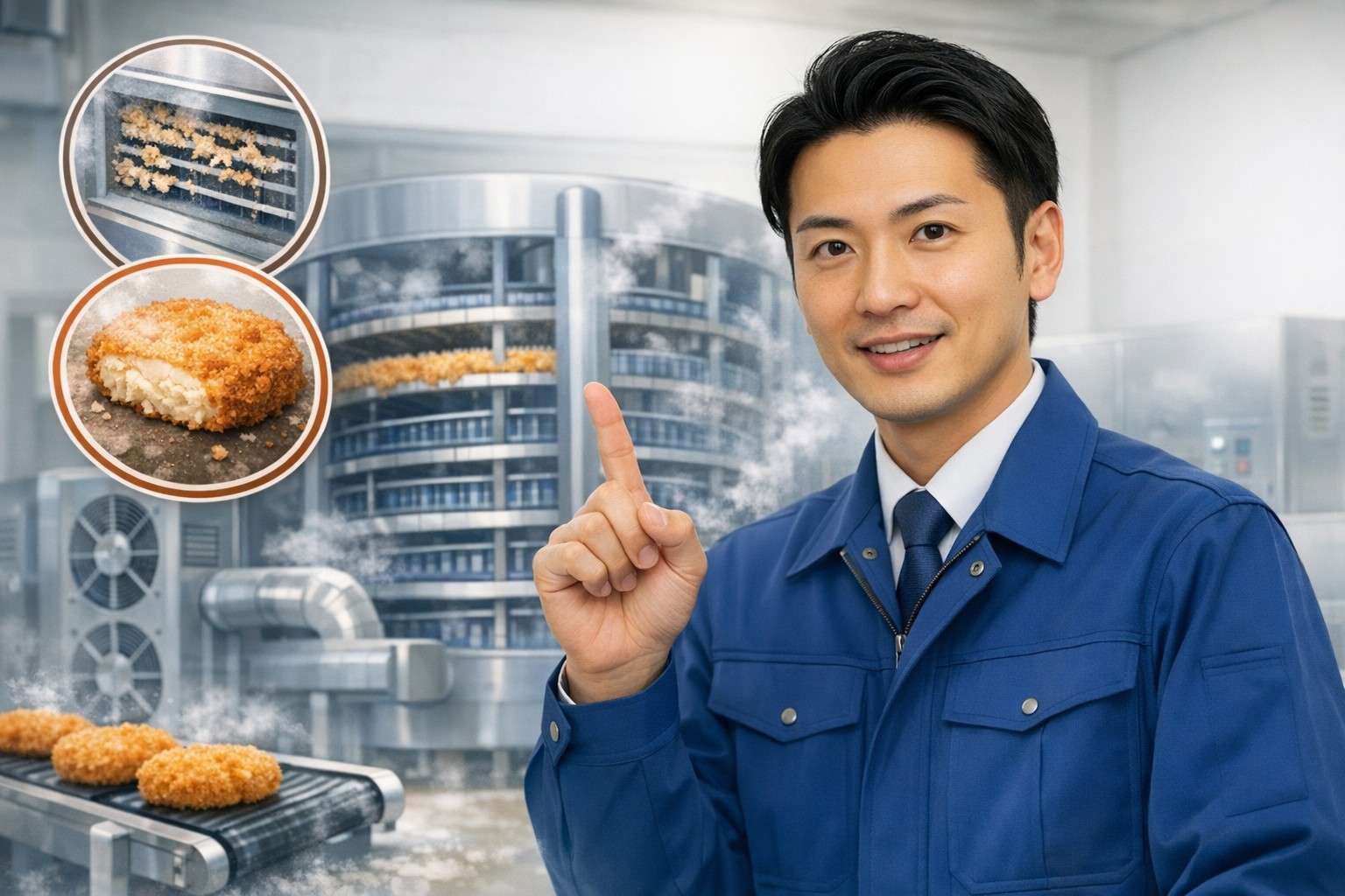「フライヤーから出てきたコロッケを凍結しているが、冷却器にパン粉が詰まって洗浄に時間がかかる」「凍結後のコロッケが白っぽく乾燥してしまい、品質にばらつきが出る」——コロッケをはじめとした揚げ物の冷凍ラインを持つ食品工場では、こうした悩みが現場で頻繁に起きています。